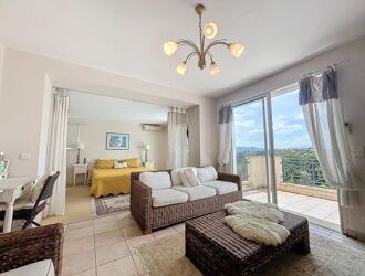 Au cœur d'une résidence de standing de 1990 située sur les hauteurs de Cannes (Mougins), vous apprécierez cet appartement traversant de 2 Pièces d'une surface de 48.50 m² en RDJ, comprenant une grande terrasse exposée Sud Ouest de 21 m² + espace verdure, bénéficiant d'une vue dégagée sur la verdure et d'un environnement calme.
